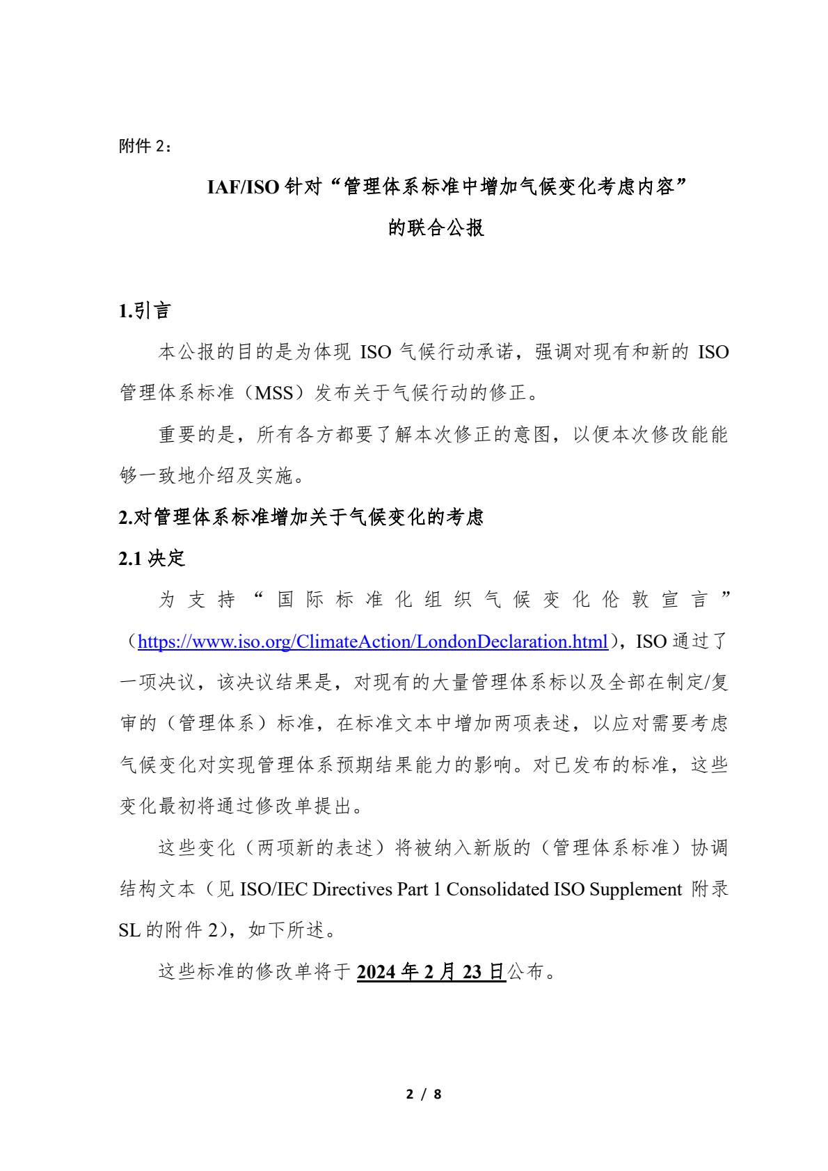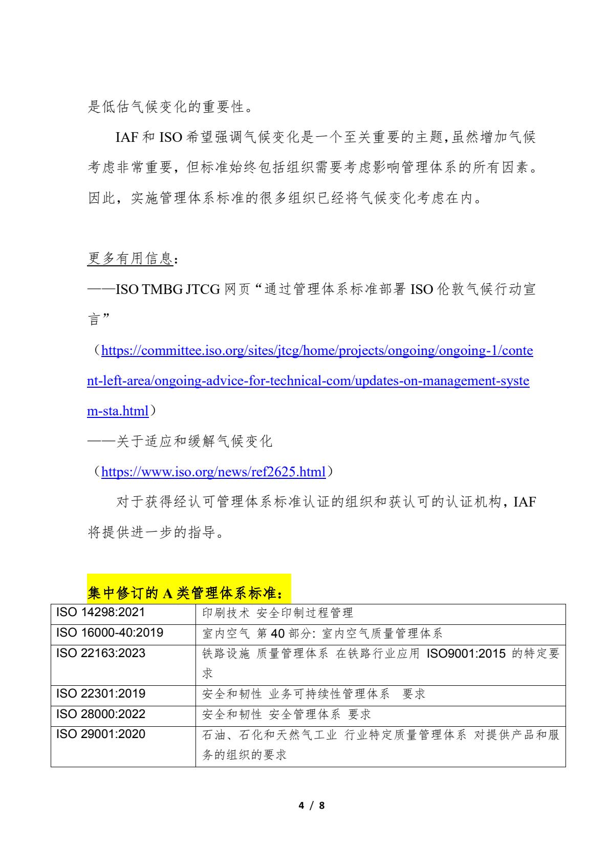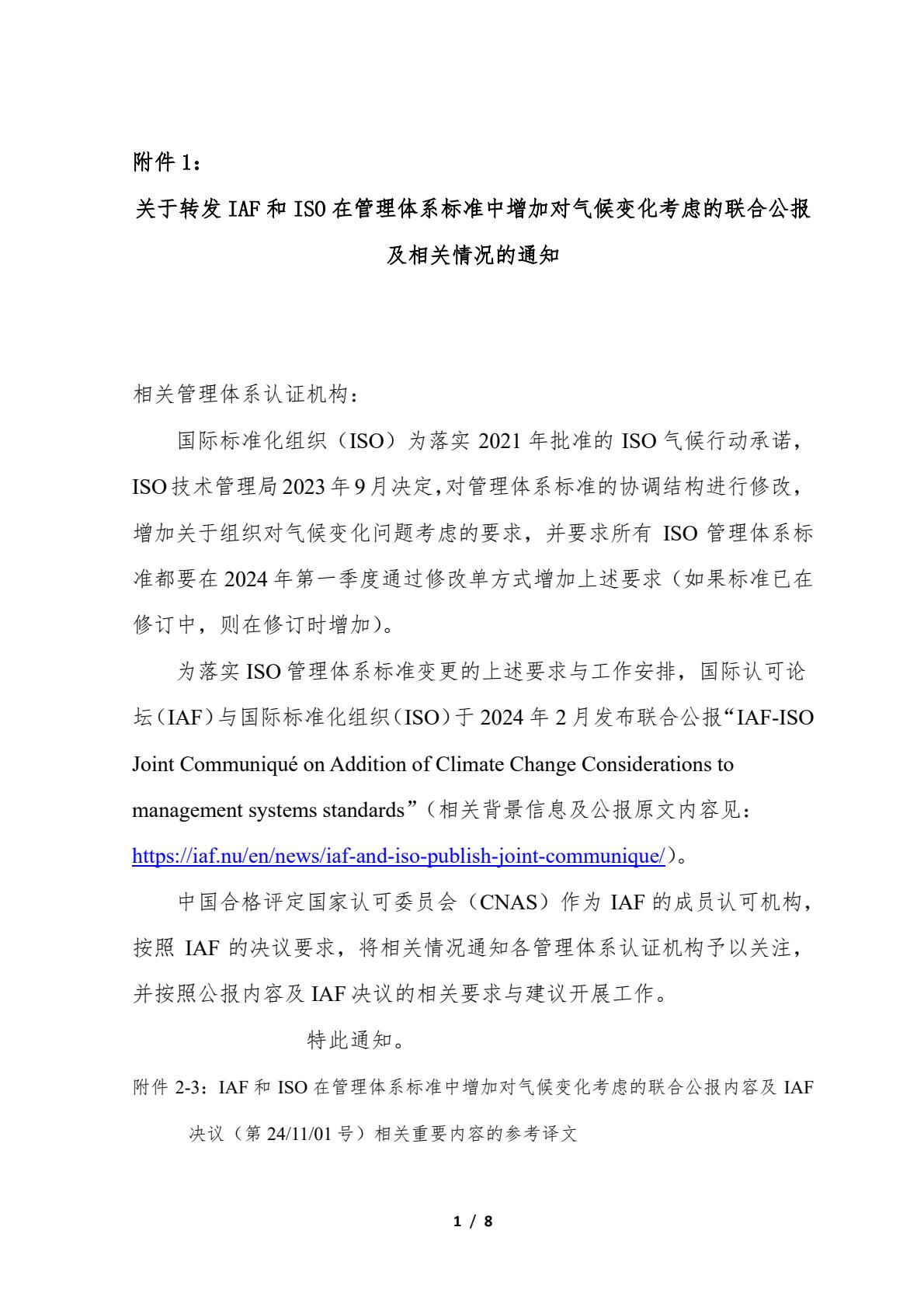 关于转发IAF和ISO在管理体系标准中增加对气候变化考虑的联合公报及相关情况的通知